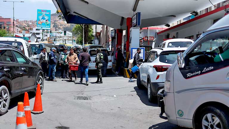 En la ciudad de La Paz el combustible escasea y en esta jornada EFE constató que hay largas filas de vehículos en las distribuidoras y muchos usuarios reportan que pasaron la noche en sus carros en espera de poder abastecerse de gasolina o diésel.
